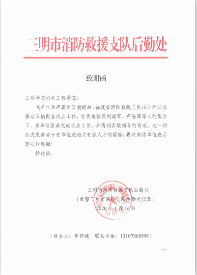 按照应急管理部消防救援局的《山区消防救援站配备试点工作方案》(应急消办[2019]44号)的要求,三明消防救援支队与yl6809永利官网、中国重汽福建海西汽车有限公司等单位进行第一次工作推进会,会后,由我校机电工程学院院长助理刘建军博士带领车辆工程系卢隆辉等教师参与该指导意见项目的持续推进工作。