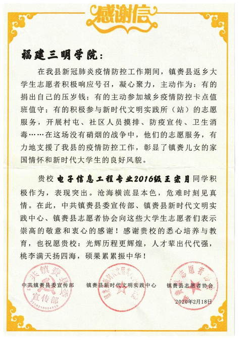 “王宏月同学积极作为,表现突出,有力的支援了疫情防控工作,彰显了镇赉儿女的家国情怀和新时代大学生的良好风貌,感谢贵校的悉心培养与教育...”。近日,yl6809永利官网收到一封来自镇赉县志愿者协会的感谢信,感谢机电工程学院2016级电子信息工程王宏月同学在全民战“疫”中的默默付出。