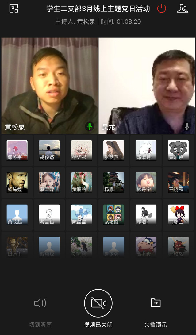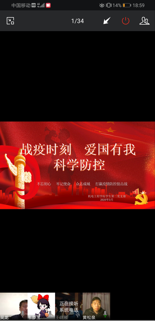 为增强青年党员使命意识,打赢疫情防控阻击战,2020年3月10日,机电工程学院学生第二党支部通过企业微信展开视频会议,举行“战疫时刻,爱国有我,科学防控”线上主题党日活动,本次会议有吴龙副校长以及第二支部全体党员参加,由第二支部书记黄松泉老师主持。