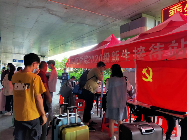 期间,党员们在各个车站的出口进行等候,等待迎接新生;在接到新生后,党员们引导新生及新生家长到等候区,且为等候区的家长、新生提供饮用水并有序排好队伍,由各个站点的负责人指引其到乘车点等候。在学校大本营的党员们,为新生登记、引导新生办理报到手续、搬运行李、解答疑问等。大家乐此不疲、井然有序。