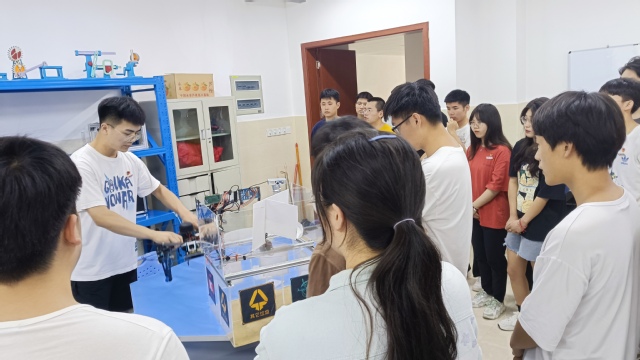 在学生党员讲解的过程中,支部书记黄松泉老师、教师党员林家乐老师也参与其中,同学生党员一起探讨一起操作。林家乐老师说,在讲解的过程中,要着重给学生党员讲解这项发明到底能为大家的生活做什么,让大家知道我们的专业知识不是学而无用。支部书记黄松泉老师也强调,举行这次特别的党日活动就是为了让学生第二党支部的学生党员们开阔视野,不要让知识停留在理论上,而是要拿到实际中来,将学习到的知识和生活结合起来,抓紧“学党史,做实事,话归来”这一核心,扣准“学习-动手-实践”环节,结合党支部党员参加专业竞赛这一着力点,全力推动党史学习教育走深、走实。最后对支部的学生党员提出敢于有梦、勇于追梦、勤于圆梦的希望。
