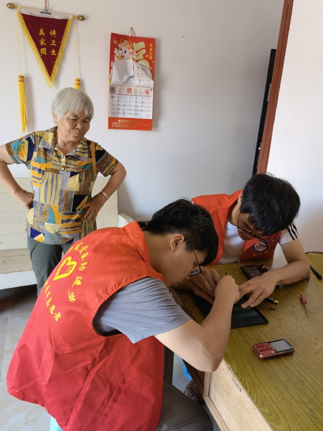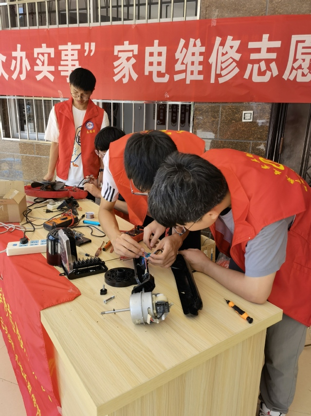 一位村民对服务队说:“我们镇现在一家电器维修店都没有,现在天气那么热电风扇坏了都没有地方修,你们真的是及时雨啊。”队员们回答道:“我们在维修过程中也得到了锻炼,提升了自己的能力,帮助别人快乐自己。”