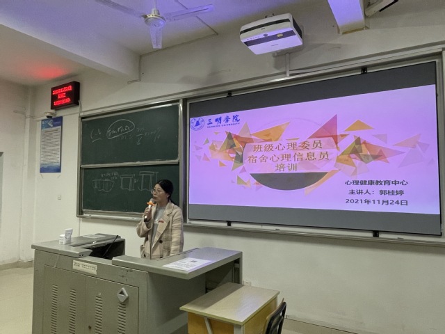 11月24日晚,机电工程学院邀请心理健康教育中心的郭桂婷老师在博学楼201教室为2021级新生开展班级心理委员、宿舍心理信息员培训,旨在营造健康的心理环境,做“三明三康”的大学生。