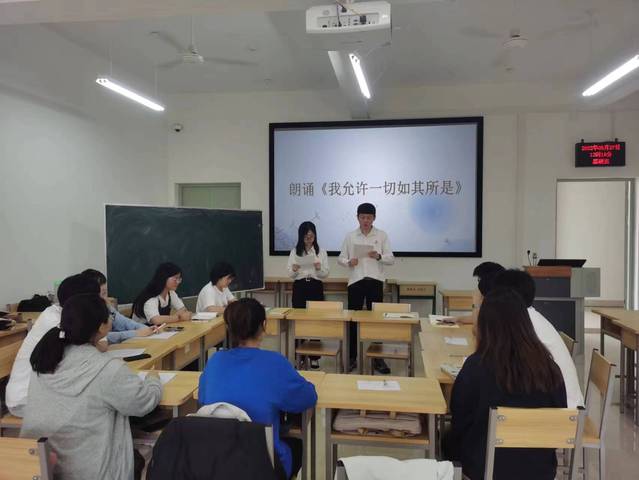 “我允许任何事情的发生,因为我知道,所有的事情,都是因缘和合而来,一切的发生都是必然……”声情并茂的诗歌朗诵带领同学们接受生活中的痛苦和迷惘,越是挫折越向前,越是难过越仰头。不做不可及的梦,让睡眠更安恬;不穿不合脚的鞋,让步伐更悠闲;不跟无谓的潮流走,让心情更宁静;不缅怀无法回头的过去,让生活更快乐用心去爱,真诚去交,不求深刻,只求简单。与世界和解,与自己和解。