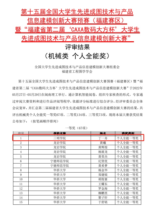 近日第十五届全国大学生先进成图技术与产品信息建模创新大赛预赛(福建赛区)暨“福建省第二届‘CAXA数码大方杯’大学生先进成图技术与产品信息建模创新大赛”评审结果揭晓,yl6809永利官网机电工程学院喜获机械类团队奖二等奖4项,机械类个人全能奖一等奖1项、二等奖4项、三等奖2项的好成绩。