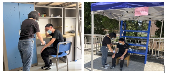 在宿舍模拟演练中,辅导员走访学生宿舍,了解学生假期生活,并重点询问学生身体状况,告知他们身体有异样要主动报告。期间为他们测量体温,发现一名同学体温偏高,伴有咳嗽等不适症状。辅导员立即报告院领导,通知值班楼栋长,将不适症状学生带至临时观察点观察,再次测量体温,楼栋长将情况报告校医院,根据医生嘱咐启动应急预案。同时,辅导员到学生宿舍排查发热学生的活动轨迹、就餐过程周围人员,确定密切接触者。同时对患病学生所在宿舍同学进行体温测量、记录。安抚学生情绪。