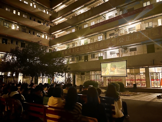 露天电影把同学们聚在一起,促使他们放下一天学习的忙碌,在主旋律电影的熏陶中放松心境,同学也引发更多的思考,是沉浸式教育中激发爱国主义热情的有效渠道。