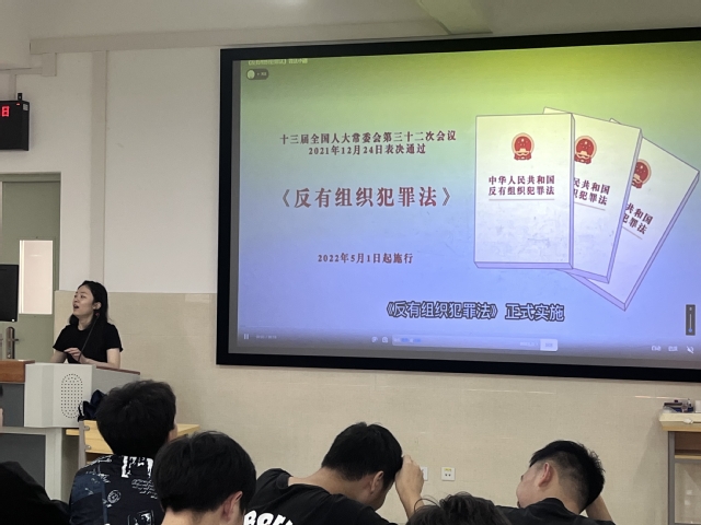 各辅导员老师以主题班会为宣传载体,用通俗易懂的语言,向学生们说明了《中华人民共和国反有组织犯罪法》的施行时间和立法意义,同时向他们解释什么是有组织犯罪,什么是恶势力组织等内容,并以真实的视频案例进行普法说法,教育引导他们自觉抵制有组织犯罪,防范有组织犯罪的侵害。