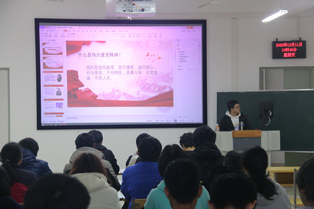 为弘扬伟大建党精神,厚植爱国情怀,赓续红色血脉,12月11日上午,机电工程学院青年党史宣讲团于工科楼B601教室开展了以“弘扬伟大建党精神,奋力书写新时代篇章”为题的宣讲活动,本次宣讲人由来自19车辆工程班的中共预备党员卢承杰担任。