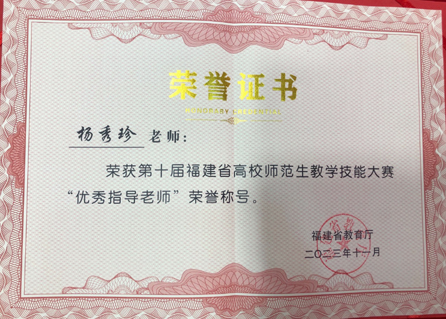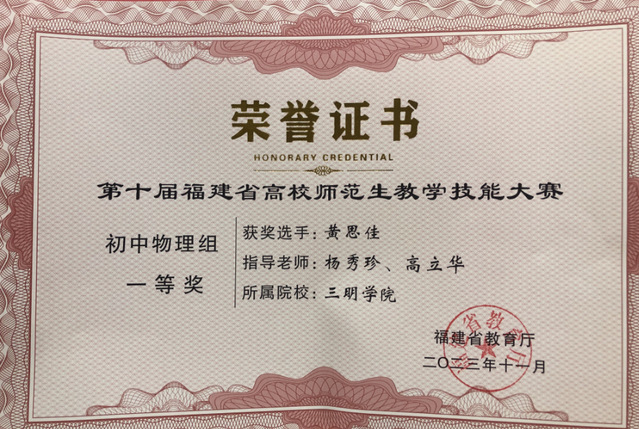 近日,在福建省教育厅举办的第十届福建省高校师范生教学技能大赛中,机电工程学院黄思佳同学荣获初中物理组一等奖,杨秀珍老师获得“优秀指导教师”荣誉称号。