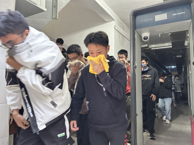 随着哨声响起,同学们用手捂住口鼻,弯腰迅速按照疏散路线,快速撤离到楼下安全空地,并完成学生人数清点。