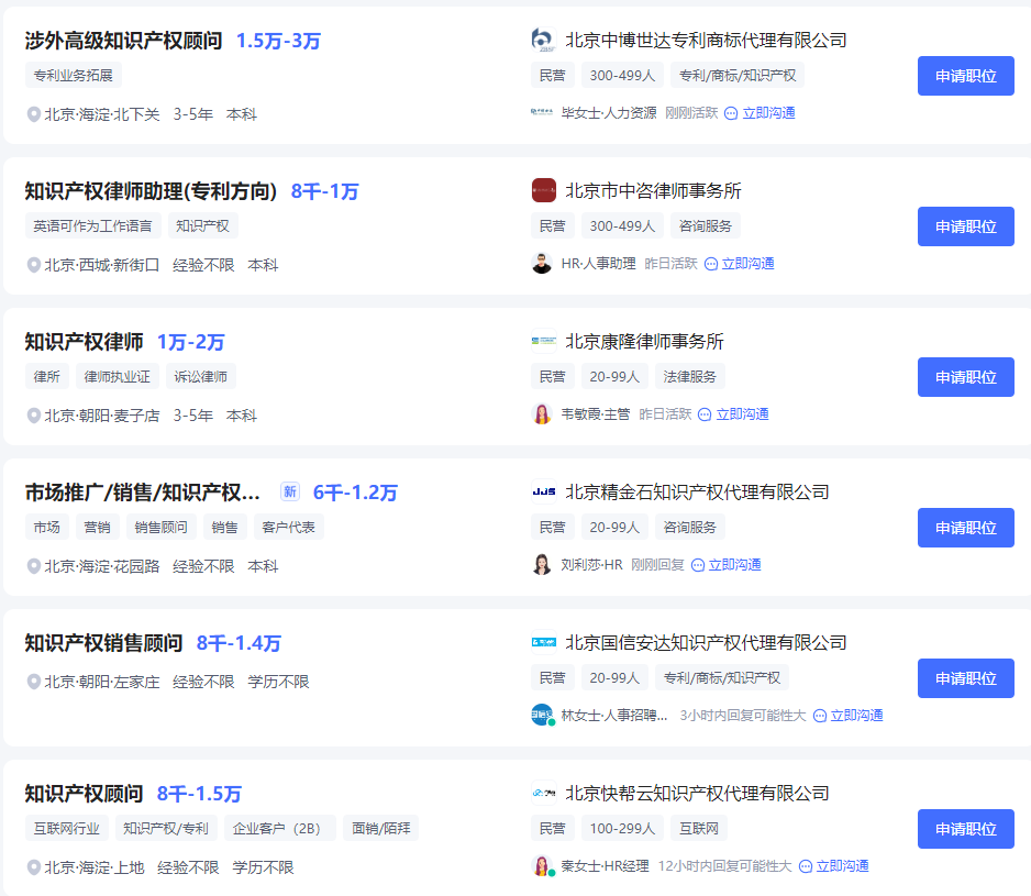 截至2023年底,我国提供知识产权服务的机构数量约为8.9万家,同比增长2.9%,其中,专利代理机构5269家,每年需招收大量从业人员。从主流招聘平台搜索知识产权相关职位,招聘知识产权运营企业和职位非常多,部分截图如下: