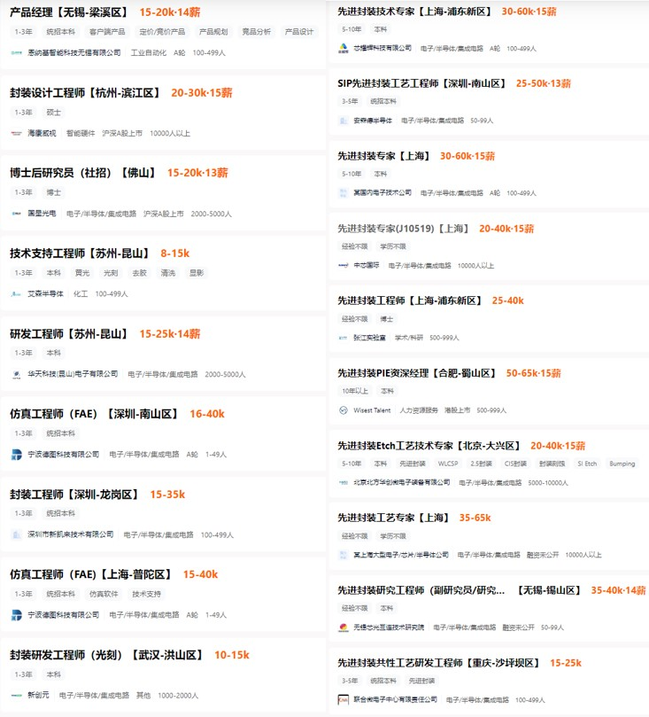从主流招聘平台搜索芯片封装相关职位,招聘芯片封装的企业和职位非常多,部分截图如下:
