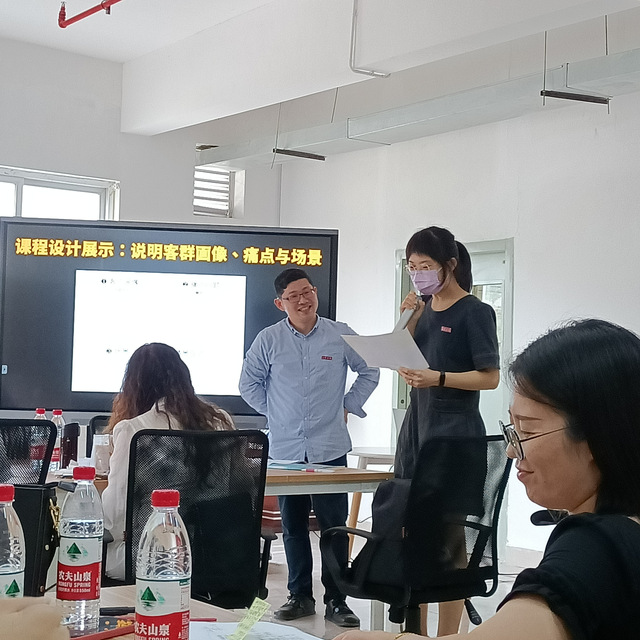 陈博士指导现场师生通过“设计冲刺”与“设计思维同理心地图”系统性工具使用,具体引导掌握“发散”与“收敛”思维训练运作,让目前授课师资能应用在自我教学难点找寻(学生面貌、学习痛点与发生场景),进行有效诊断与分析。并通过研讨过程中清楚说明创业基础如何在“专创”“思创”与“赛创”融合架构下,引导教学达成“师生共创”最终实践教学目标。