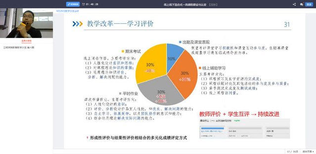 本次教学沙龙由艺术与设计学院承办,服装与服饰设计系刘阳老师作为主讲人主导了沙龙活动的分享和交流。以“线上线下混合式一流课程建设与认定”为主题,在2个多小时的时间里,主讲人结合个人的课程建设与申报经验,分别从一流课程建设的总体要求、一流混合式课程建设与认定、教师自我提升之快速通道三个方面进行了解读和经验分享。