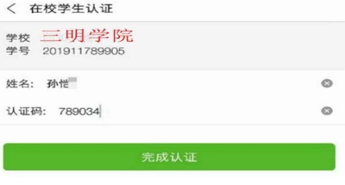 (3)完成本校学生认证。本校学生认证信息由四个部分构成:学校名称+学号+真实姓名+认证码(身份证号码后六位)。例如:yl6809永利官网+学号201911789905+孙凯+789034(身份证号码后六位);
