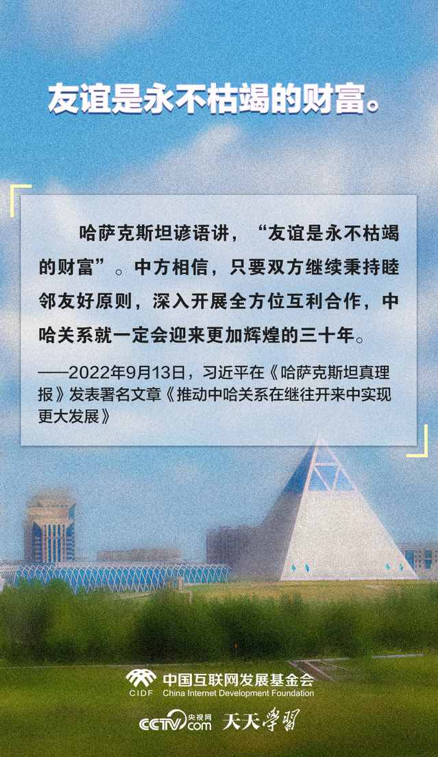 天天学习今年是中国和哈萨克斯坦建交30周年。30年来,中哈关系阔步向前,实现了从睦邻友好到战略伙伴关系、再到永久全面战略伙伴关系的持续推进,树立了独一无二的双边关系定位,打造了相互尊重、睦邻友好、同舟共济、互利共赢的新型国家关系。习近平主席这次对哈萨克斯坦进行的国事访问,必将进一步深化双方政治互信,拓展两国全方位合作,开启中哈关系发展又一个黄金三十年。