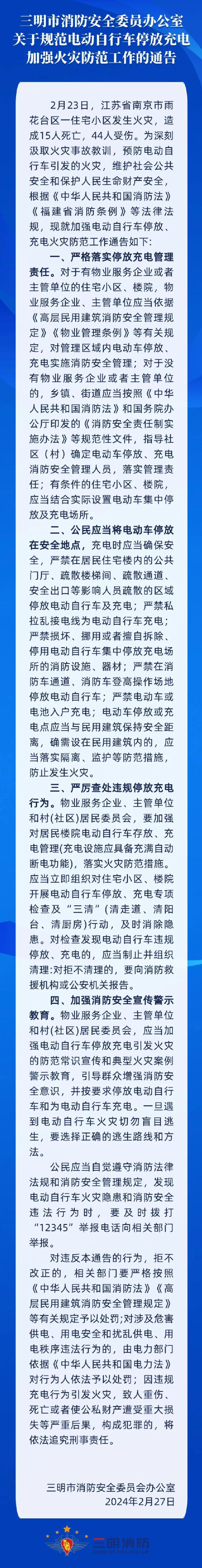【平安校园】三明市消防安全委员会办公室关于规范电动自行车停放充电加强火灾防范工作的通告