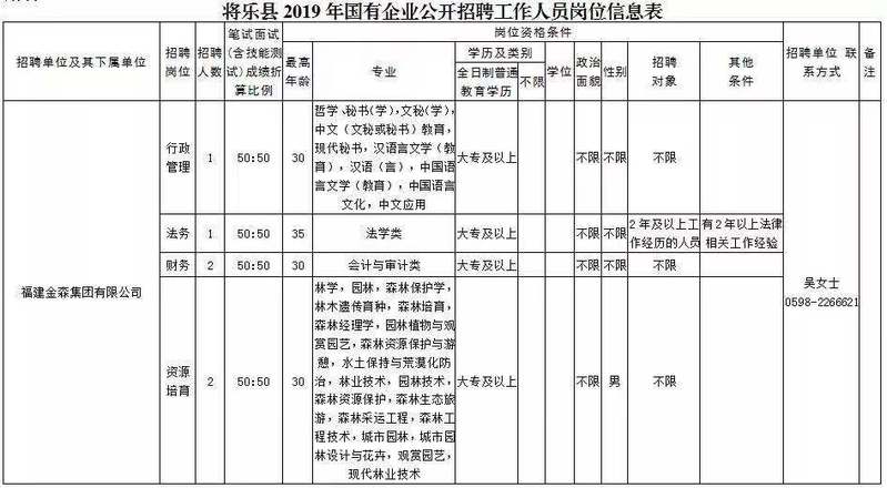 (一)招聘岗位。各招聘企业具体的招聘岗位、招聘人数、资格条件详见《2019年将乐县部分国有企业公开招聘工作人员岗位信息表》(附件)。