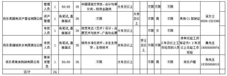 2019年将乐县国有企业公开招聘工作人员通告根据《关于规范县属国有企业人员招聘工作的通知》(将委办〔2018〕106号)和《将乐县人民政府县长办公会议纪要》(〔2019〕15号)等有关要求,参照《三明市事业单位公开招聘工作人员暂行办法》(明人发〔2012〕33号),按照“公开、平等、竞争、择优”的原则,福建金森集团有限公司、将乐县国有资产营运有限公司等5家我县国有企业面试社会公开招聘24名工作人员。此次公开招聘工作由中国海峡人才市场三明分部负责具体实施,将乐县人力资源和社会保障局负责全程监督、协调与指导。现将有关事项通告如下: