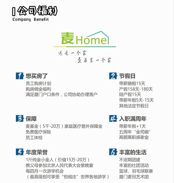 2、福利保障:五险+商业保险+麦基金(5K-20W)医疗&意外互助金,保障你和家人;
