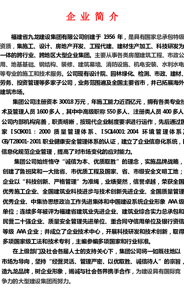 福建省九龙建设集团有限公司创建于1956年,是具有国家总承包特级资质的福建省建筑业龙头企业。集施工、设计、房地产开发、工程代建、建材生产加工、科技研发为一体的跨行业、跨地区大型企业集团。主要从事各类房屋建筑工程、市政公用、地基基础、钢结构、装修、建筑幕墙、消防设施、机电安装、水利水电等专业的施工和技术服务。企业拥有各类专业技术及管理人员1200多人,其中中高级职称550多人、一级建造师及各类注册类人员达100多人。企业注册资本为三亿零一十八万元。企业年施工产值近六十亿元。企业综合实力位列福建省建筑业前茅,已通过国家ISO9001:2015质量管理体系、ISO14001:2015环境管理体系及GB/T45001-2020职业健康安全管理体系的认证,公司现有设计院、园林绿化、检测、市政、建材、劳务、投资管理等多家子公司,业务范围遍及全国主要省市,并已拓展海外建筑市场。