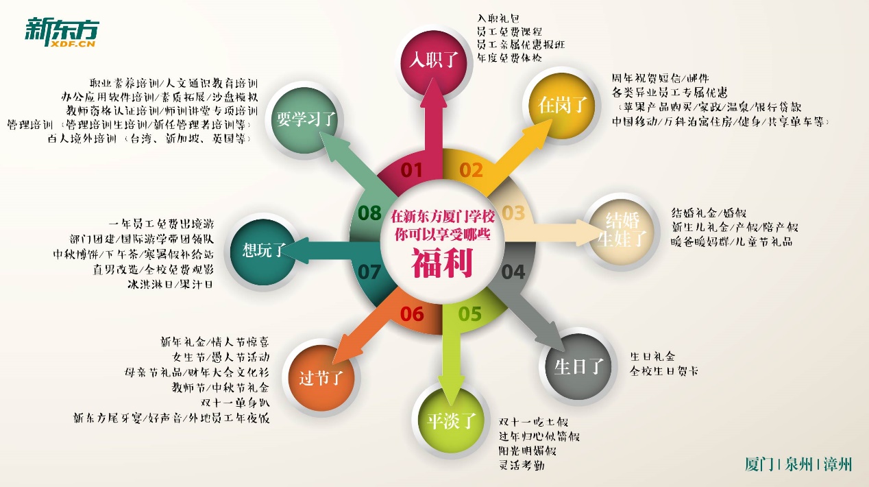新东方教育科技集团于2008年7月正式登陆厦门,已经发展成为闽南最大的教育机构。目前在厦门、泉州、漳州拥有40余教学区,分布在思明区、湖里区、海沧区、集美区、同安区、泉州、漳州等地。总教学面积超过92000平米,全职教职员工2000余人,在厦门每年培训学员超过37万人次。学校业务范围涵盖3-12岁泡泡少儿教育、12-18岁优能中学教育、出国留学考试培训与咨询服务、大学生学习培训、国际游学等板块,已经成为综合的一站式教育机构,受到当地家长和学生的信任和认可。厦门新东方向每一个怀揣梦想的人敞开着大门,并将一直秉承“ 一切为学生着想,一切以质量取胜”的理念,在未来的无数日子里,厦门新东方将辛勤书写,扬起更多人的梦想之帆。