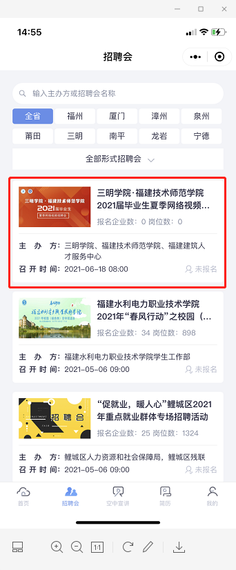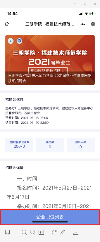 在小程序底部导航栏中选中“招聘会”,选择相应的招聘会。进入招聘会详情页,点击企业列表,查看企业与职位。