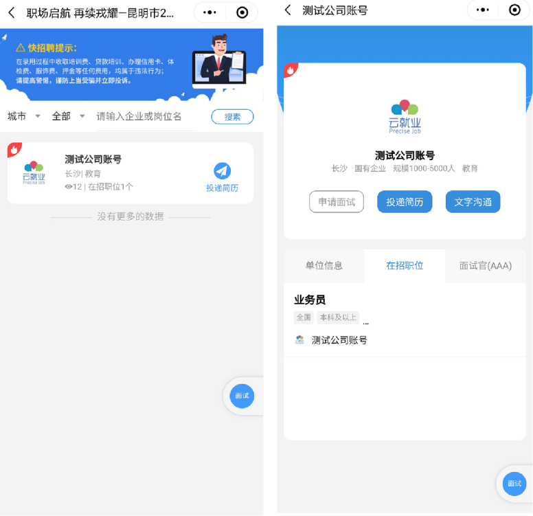 简历投递:视频双选会召开前,求职者可提前点击单位名称查看单位详细信息,并进行简历投递以及跟单位进行文字沟通。