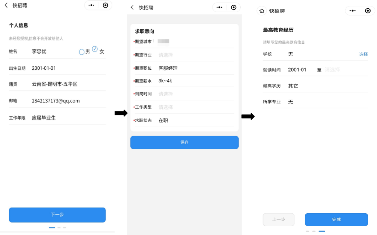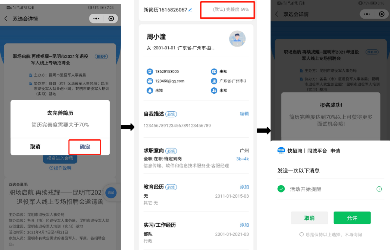返回会场主页,会提醒完善简历信息,点击确认完善“自我描述”“教育经历”“工作经历”等栏目,顶部会有提醒简历的完整度,完整度达70%即可,返回会场主页进入招聘会现场,如不小心退出小程序可扫会场二维码再次进入。