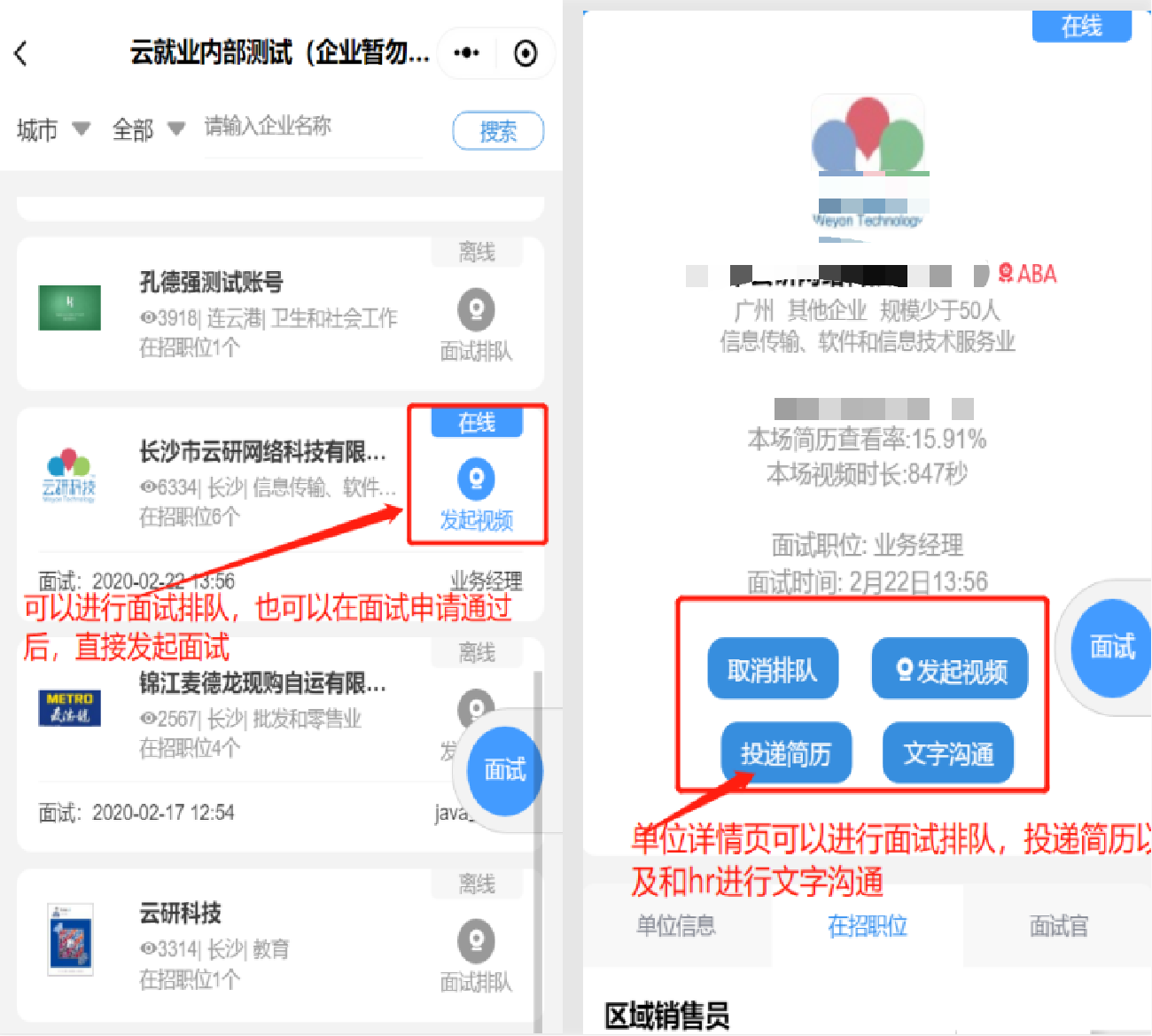 视频面试:招聘活动当天单位列表标记为“视频在线”的参会单位,求职者可以点击“面试安排”按钮以及在单位详情页面,点击“申请面试”。招聘单位同意后即可发起视频。