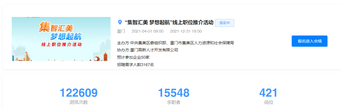 为响应由厦门市委组织部、市人社局主办的“2021厦门人才服务月”活动,暨作为厦门市集美区“集美人才节”的系列活动之一,特举办“集智汇美 梦想起航”线上职位推介活动,特邀并精选40余家集美区上市、三高等优质企业,开启线上引才政策与职位推介。帮助高校毕业生更好地了解厦门市、了解集美区,找到自己理想的工作岗位。