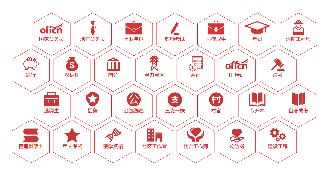 公务员招录考试培训、事业单位招录考试培训、教师资格证及教师招录考试培训、专升本/研究生/自考成考等学历提升考试培训、培训医疗卫生类资格证书及招录考试培训、国家电网电力考试培训、银行/农信社/国企招聘入职考试培训、注册会计师考试培训、消防建工考试培训等