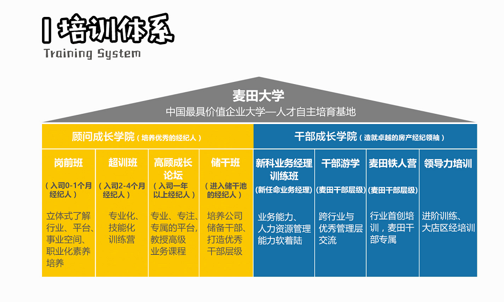 多年来,麦田房产始终坚持以人为本的企业发展理念,致力于为员工提供全面的成长路径和发展空间。麦田与全国多家高校签署合作协议,探索校企合作模式,确保人才输入。在员工培育上,麦田倡导终身学习,以打造学习型组织,建设大学型企业为己任,通过浓厚的文化氛围和强大的人才育成体系,自主培育正直、诚信的房产顾问,2017年,麦田大学获得由中国企业教育百强颁发的《中国最具价值企业大学》和《中国企业培训示范基地》的奖项,这就是社会对麦田人才培育模式的肯定。