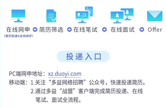 招聘微信公众号:多益网络招聘(duoyijobs)及时获取校招资讯、查询应聘进度
