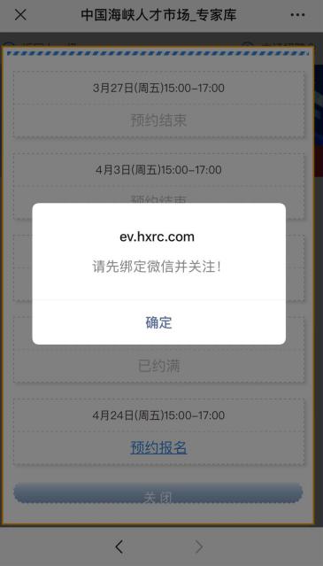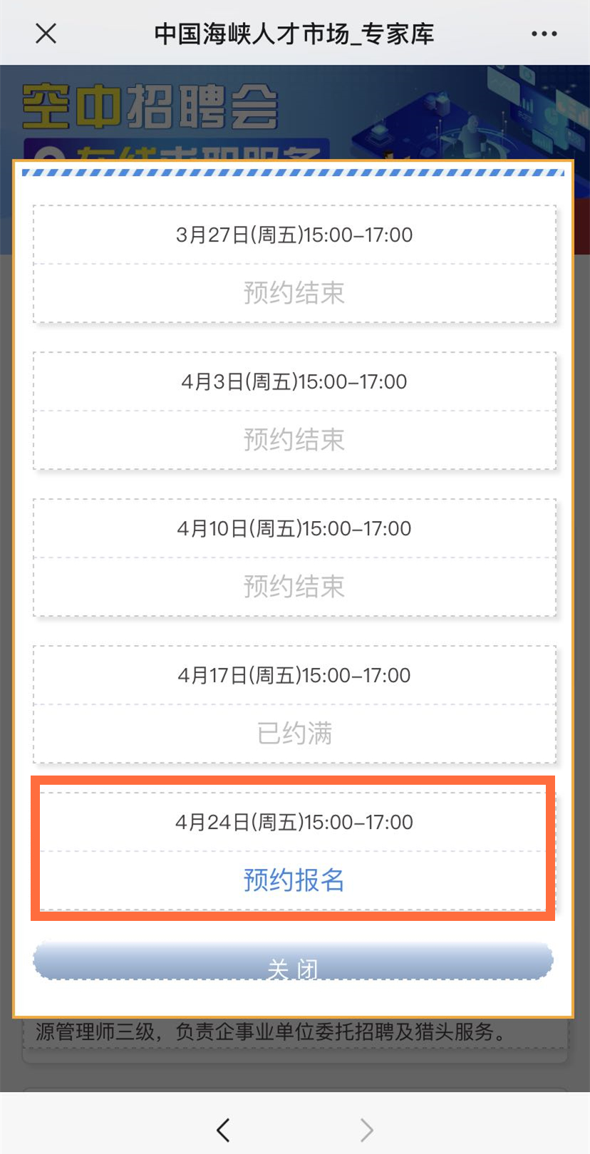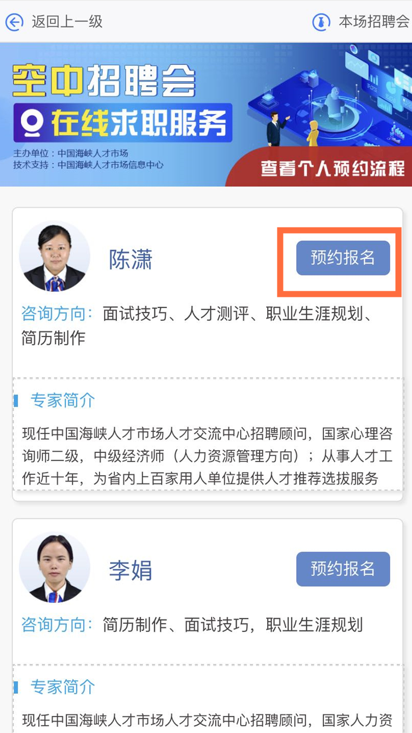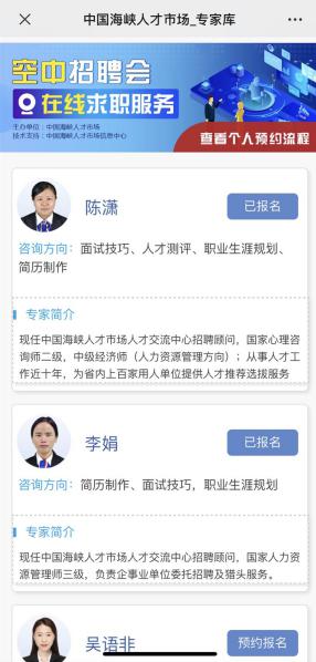 退出海峡人才网微信公众号关注界面,重新点击活动链接,点击预约,提示预约成功后,请登陆个人后台完善简历信息,以便专家为您做好职业规划)。