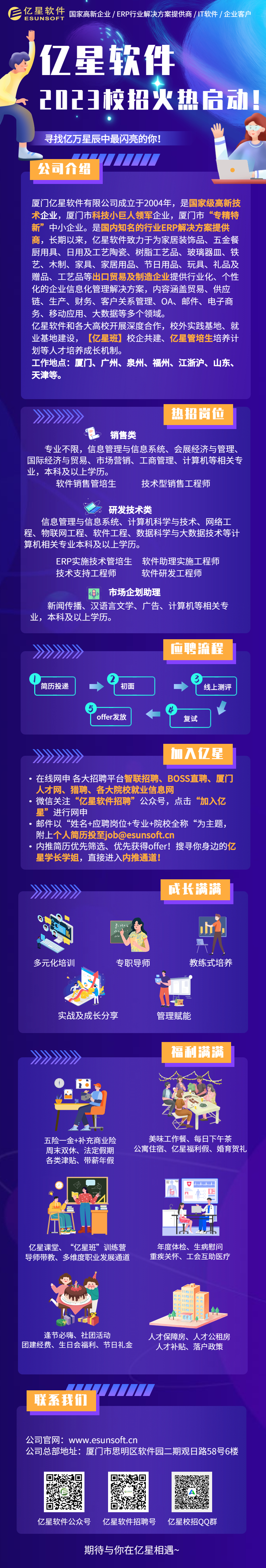 厦门亿星软件有限公司成立于2004年,是国家高新技术企业,厦门市科技小巨人领军企业,厦门市“专精特新”中小企业。是一家集软件研发、销售、服务为一体的软件公司,是国内知名的行业ERP解决方案提供商,长期以来,亿星软件致力于为家居装饰品、五金餐厨用具、日用及工艺陶瓷、树脂工艺品、玻璃器皿、铁艺、木制、家具、家居用品、节日用品、玩具、礼品及赠品、工艺品等出口贸易及制造企业提供行业化、个性化的企业信息化管理解决方案,内容涵盖贸易、供应链、生产、财务、客户关系管理、OA、邮件、电子商务、移动应用、大数据等多个领域。