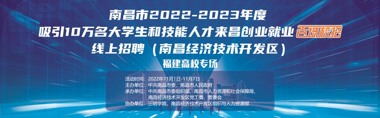 为贯彻落实中央人才工作会议精神,落实省委、市委党代会要求,依据中共南昌市委组织部、南昌市人了资源和社会保障局要求,瞄准市党代会提出的“每年吸引10万大学生和技能人才来我市创业就业”的目标,按照全市“百场校招”活动的统一安排,扎实有效做好支持大学毕业生和技能人才来昌留昌创业就业服务。因受新冠肺炎疫情影响,多个地区和高校采取了限制措施。经研究,决定开展南昌市2022-2023年度吸引10万名大学生和技能人才来昌创业就业“百场校招”网络招聘会福建高校专项活动。