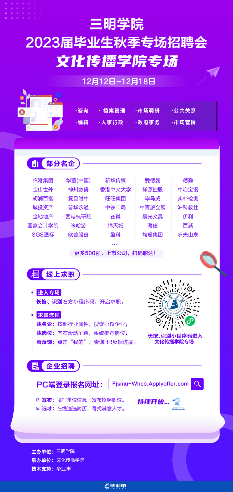 yl6809永利官网2023届毕业生秋季专场招聘会——文化传播学院专场(12.12-12.18)