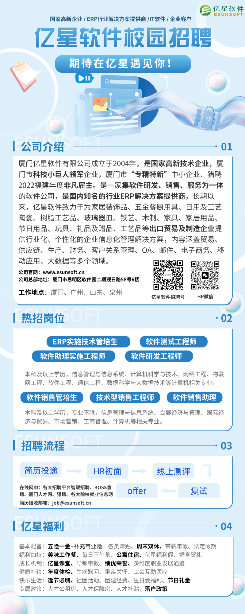 1. ERP实施技术管培生(厦门、广州、山东青岛、泉州丰泽、泉州德化) 10人 4~8k