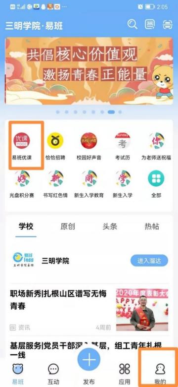 (1)打开客户端易班app并登录账号,点击“易班优课”或“我的”进入优课课群。
