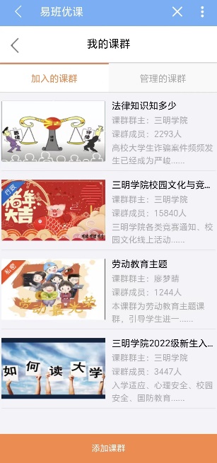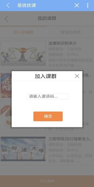 (2)选择“易班优课”进入,跳转到个人主页后,点击“课群”进行“课群添加”,输入课群邀请码B4TJKD56,完成课群添加。
