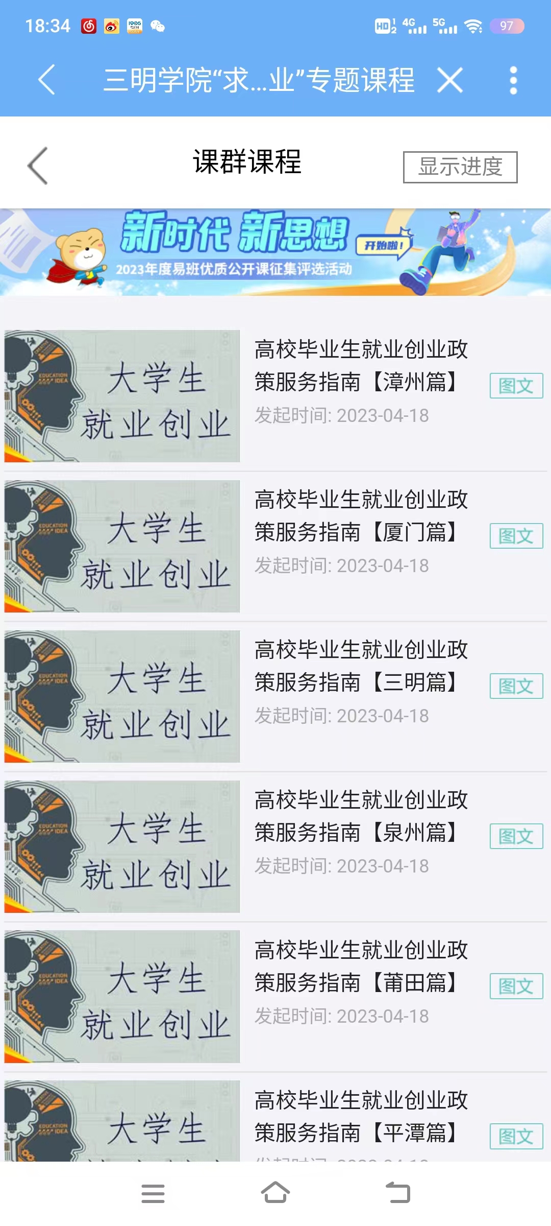 添加完课群“yl6809永利官网‘求职辅导促就业’专题课程”后,进入“课群课程”中学习该课群所有课程内容,点击右上角“显示进度”可查看学习状态“已完成”或“未完成”。