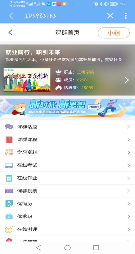 再输入课群邀请码TWN2ZSDH添加课群“就业同行,职引未来”专题课程后,点击“在线考试”,即可看到答题活动入口。