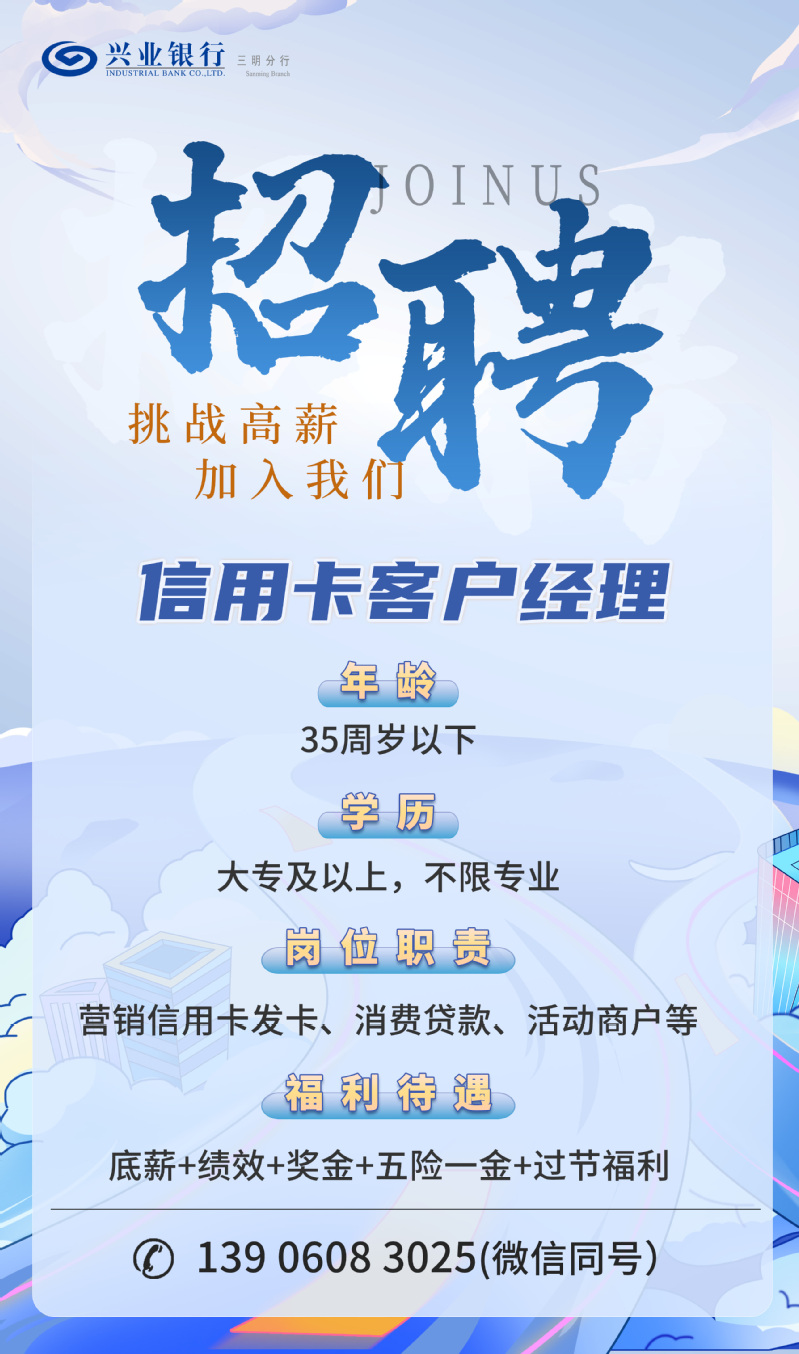 兴业银行三明分行信用卡客户经理招聘启事