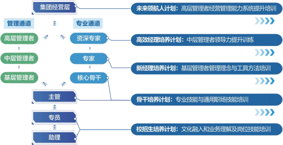 海大设有双向职业发展通道,每个层级均设有对应的培养体系。应届生进入公司后,经过系统的学习 和培养,可以走专业发展通道,也可以走管理发展通道。