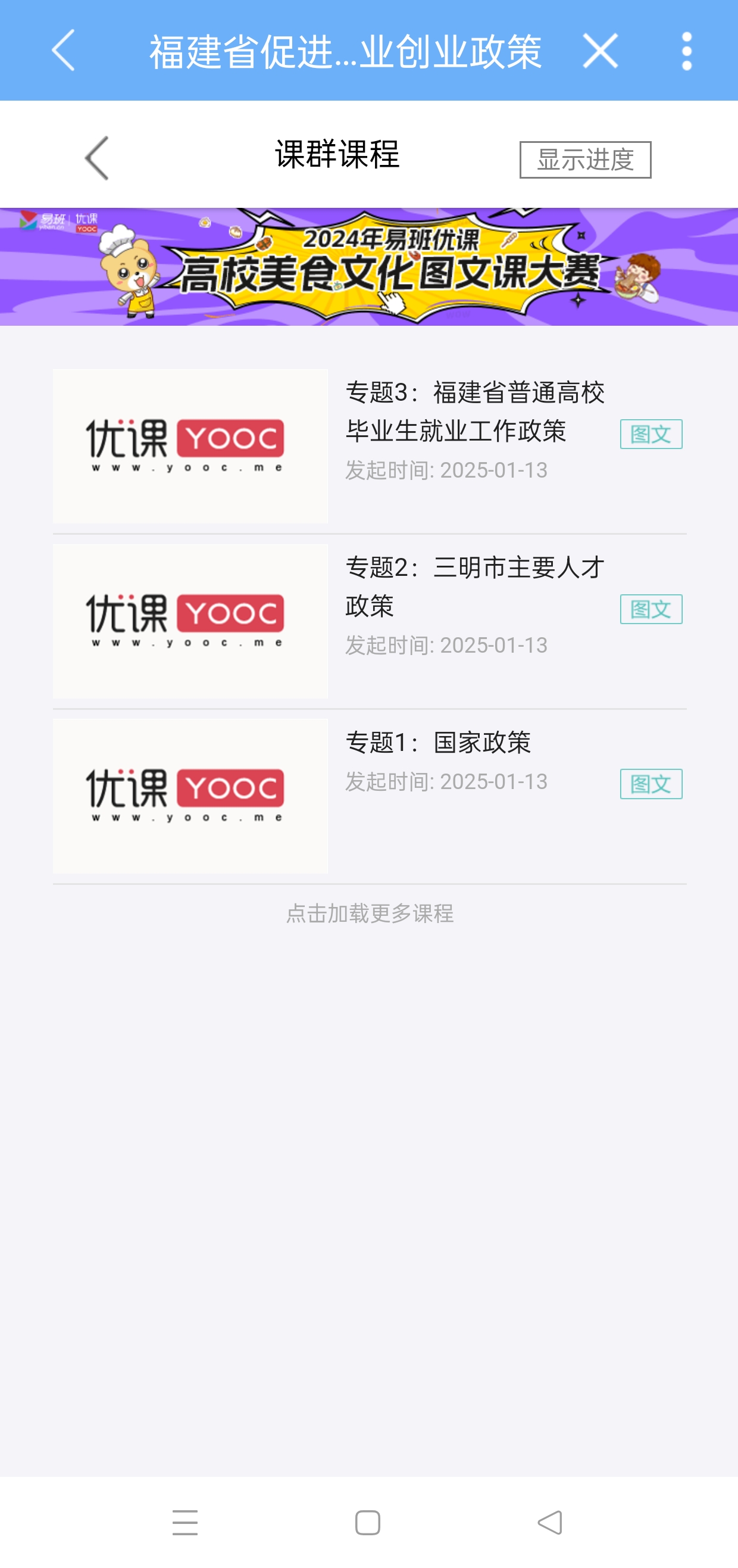 3.添加完课群“福建省促进高校毕业生就业创业政策”专题课程后,进入“课群课程”中学习该课程所有内容,点击右上角“显示进度”可查看学习状态“已完成”或“未完成”。