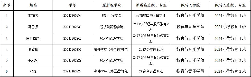 根据《yl6809永利官网转专业管理办法(修订)》文件精神,经学生本人申请、教育与音乐学院组织考核,经党政联席会研究通过,现将拟接收同学名单公示如下: