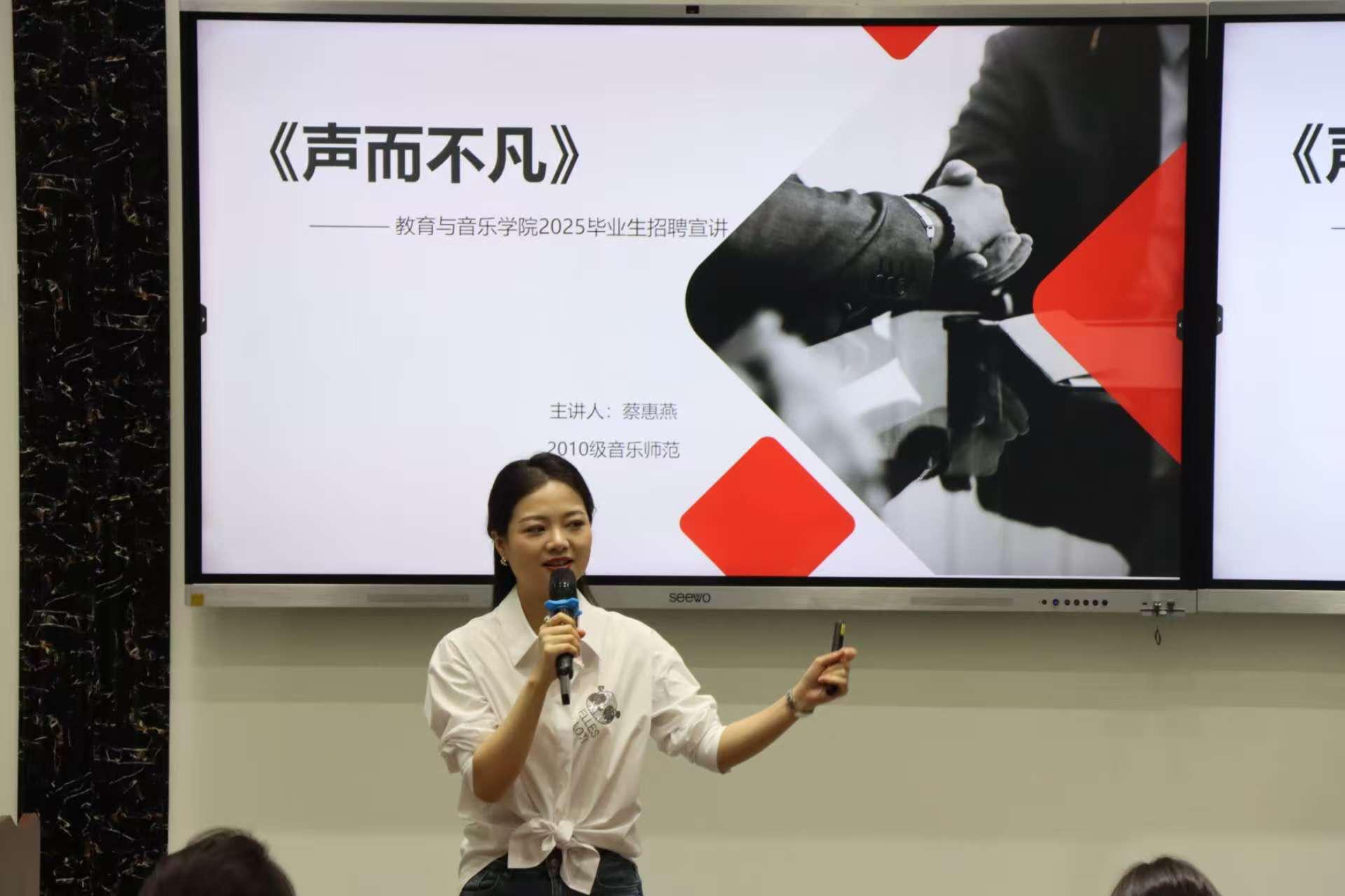 5月7日,教育与音乐学院特邀2010级优秀校友、知名企业家蔡惠燕女士返校开展创新创业与就业指导专题讲座。学院党委书记伍荣生主持活动,2025届毕业生代表100余人现场聆听。