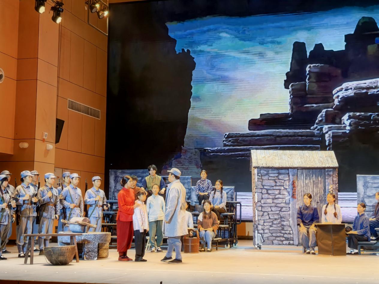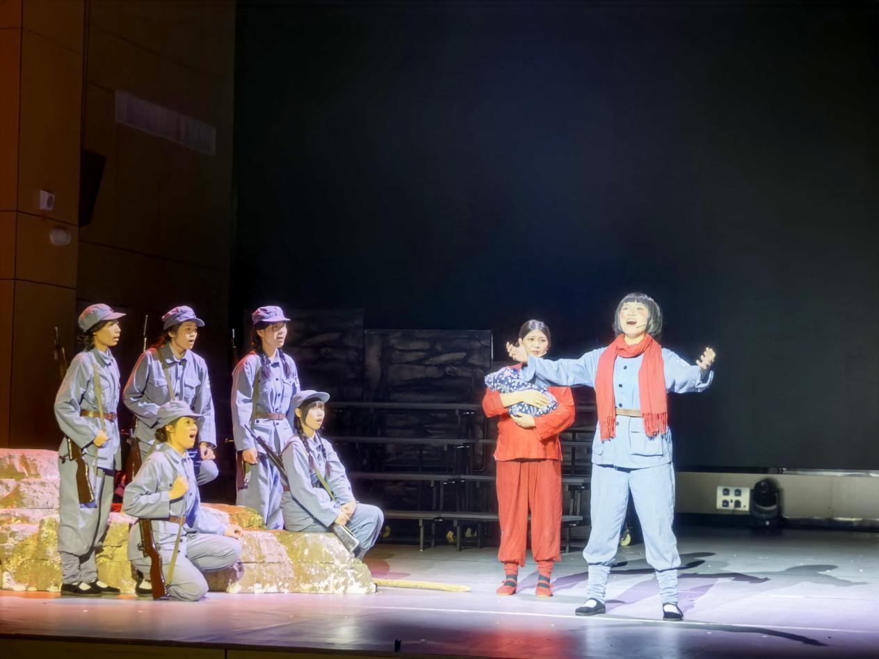 演出以《只说一句俺保证》开篇,瞬间将观众带回烽火连天的峥嵘岁月。海棠、林生、孙九龙等剧中人物在舞台上鲜活再现,经典唱段《等着我,亲爱的人》《再看一眼亲人吧》《沂蒙的女儿》如泣如诉,深刻勾勒出沂蒙军民在血与火中淬炼出的水乳交融、生死与共的壮阔图卷。舞台之上,灯光、布景与多媒体交相辉映,深情旋律与动情演绎完美融合,将家国大义与儿女情长层层铺展,令观众心潮澎湃。演出最后以磅礴的合唱《沂蒙山,永远的爹娘》结尾,赢得了在场观众的热烈掌声。据海棠的饰演者、音乐学专业学生朱纭介绍,团队从选段编排到舞台呈现历经4个月打磨,“每一次排练都是对革命历史的再学习,对专业能力的再提升”。